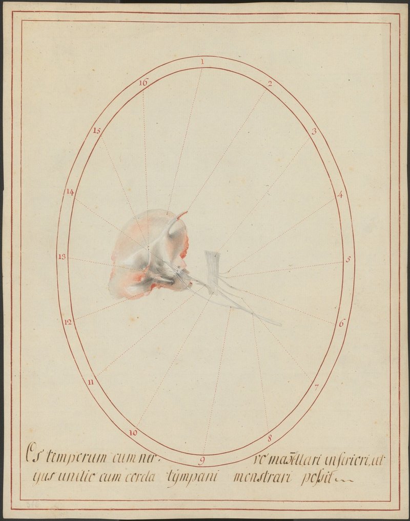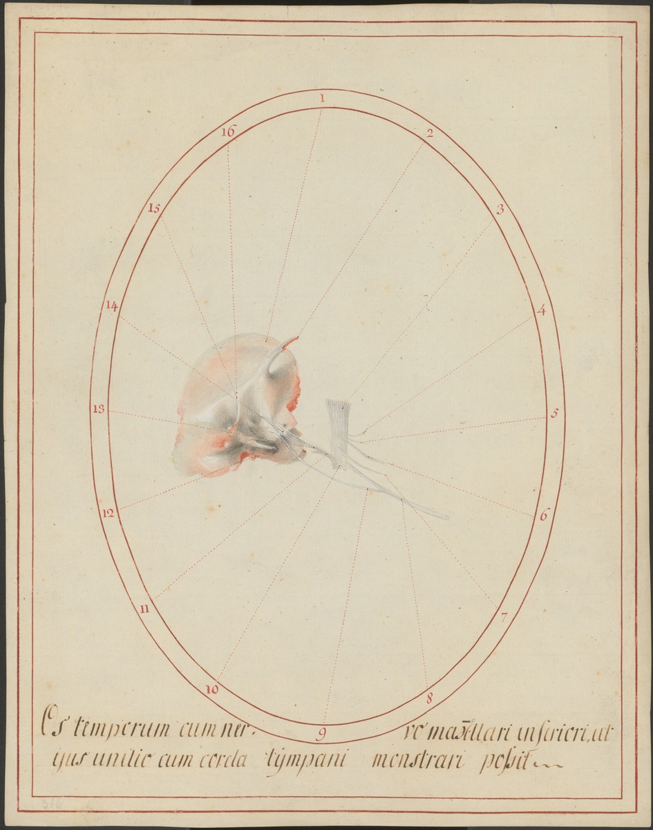Rechtes Schläfenbein (Os temporale) mit Darstellung des Nervus mandibularis und des Verlaufes der Verbindung (Chorda tympani) zwischen Gesichtsnerv (Nervus facialis) und Zungennerv (Nervus lingualis).