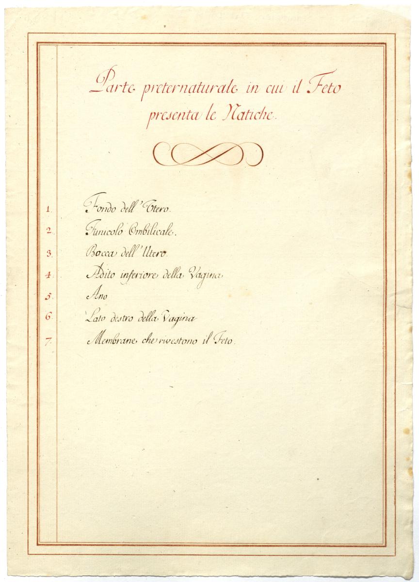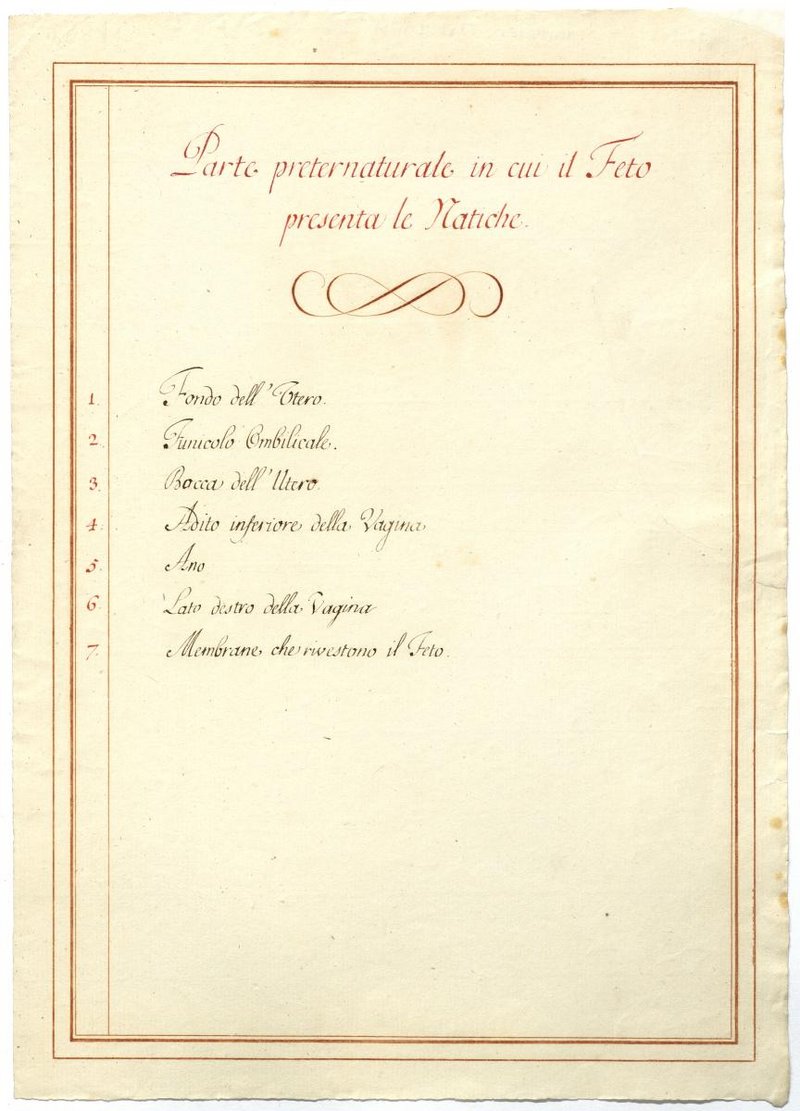 Der Text ist die ergänzende Beschreibung in italienischer Sprache zum anatomischen Wachsmodell unterschiedlicher Geburtenszenarien.
