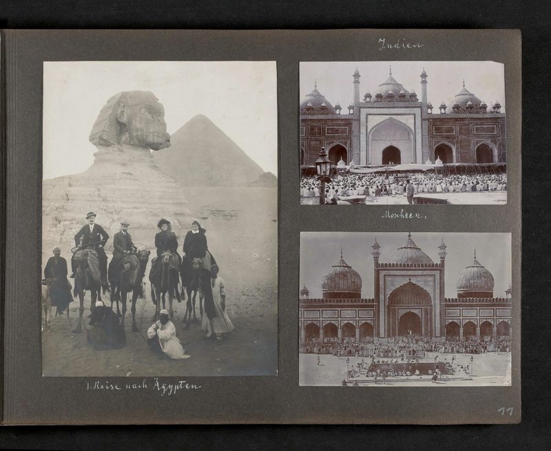 Links: Karl David Lindner mit anderen Reisenden auf Kamelen vor den Pyramiden und der Sphinx in Ägypten. Rechts: zwei Abbildungen von Moscheen in Indien.