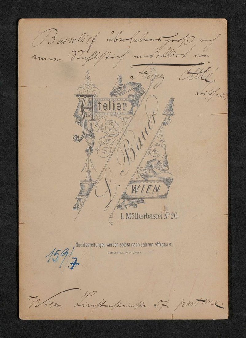 Das als Vorlage dienende Relief wurde 1888 von Franz Georg Ettle, Wien, die Fotografie von Atelier Louis Bauer, Wien, angefertigt. Rückseitig mit Angaben über die Reliefanfertigung.