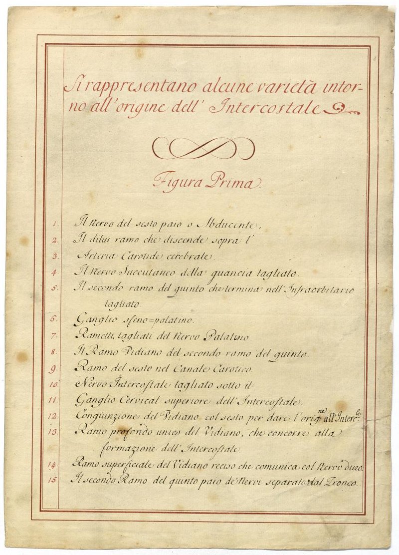 Der Text ist die ergänzende Beschreibung in italienischer Sprache zum anatomischen Wachsmodell der Leitungsbahnen der Kopf-Hals-Region.