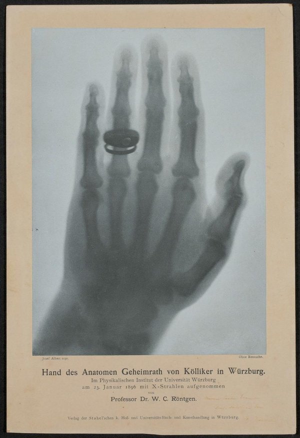 Röntgenaufnahme vom 23. Jänner 1896, aufgenommen im Physikalischen Institut der Universität Würzburg von Wilhelm Conrad Röntgen.