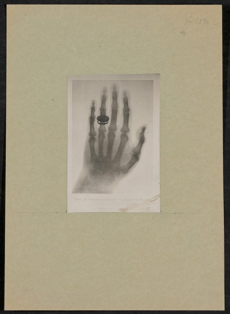 Röntgenaufnahme vom 23. Jänner 1896, aufgenommen im Physikalischen Institut der Universität Würzburg von Wilhelm Conrad Röntgen.