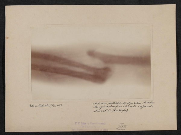 Die Aufnahme wurde von Josef Maria Eder und Eduard Valenta angefertigt. Vorderseitiger Stempel der K. K. Lehr- u. Versuchsanstalt für Photographie und Reproduktionsverfahren, Wien, handschriftliche Signierung V 12233 und Datierung 12 V 1896. Rückseitiger Stempel Otto Krumpel, Wien.