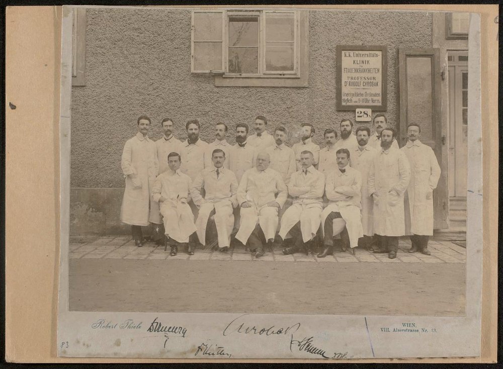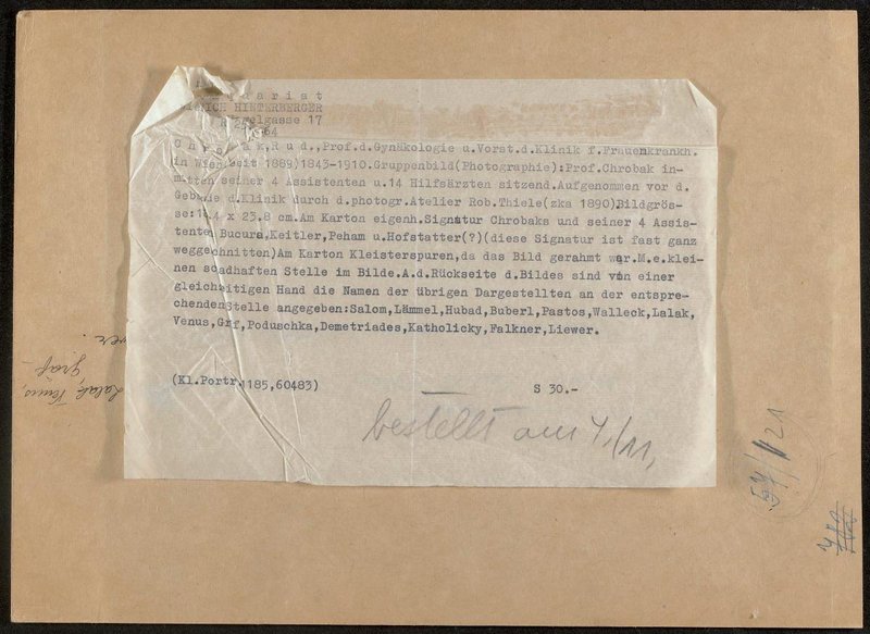 Abgebildet sind in der 1. Reihe: Constantin J. Bucura, Heinrich Keitler, Rudolf Chrobak, Heinrich Peham und Robert Hofstätter; in der 2. Reihe die Hilfsärzte: Salom, Lämmel, Hubad, Buberl, Pastos, Walleck, Lalak, Venus, Gräf, Poduschka, Demetriades, Katholicky, Falkner, Liewer. Die Fotografie wurde von Robert Thiele, Wien, angefertigt. Anlass war der 60. Geburtstag von Viktor Mucha, Prof. Dr., Direktor des Allgemeinen Krankenhauses der Stadt Wien, Wien.