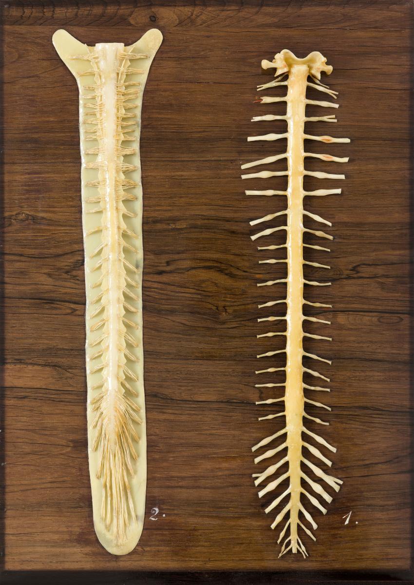 1. Die harte Rückenmarkshaut (Dura mater spinalis) mit ihren Fortsätzen auf die Spinalnerven (Nervi spinales). 2. Die 9.—12. Hirnnerven (Nervi craniales IX.—XII.) des Hirnstammes und das Rückenmark (Medulla spinalis) mit seinen Nerven (Nervi spinales). Die harte Haut (Dura mater spinalis) ist eröffnet, um den Durchtritt der Nerven durch sie zu zeigen; von hinten.