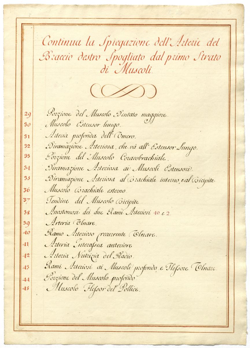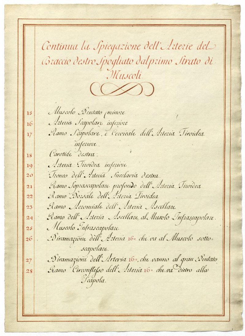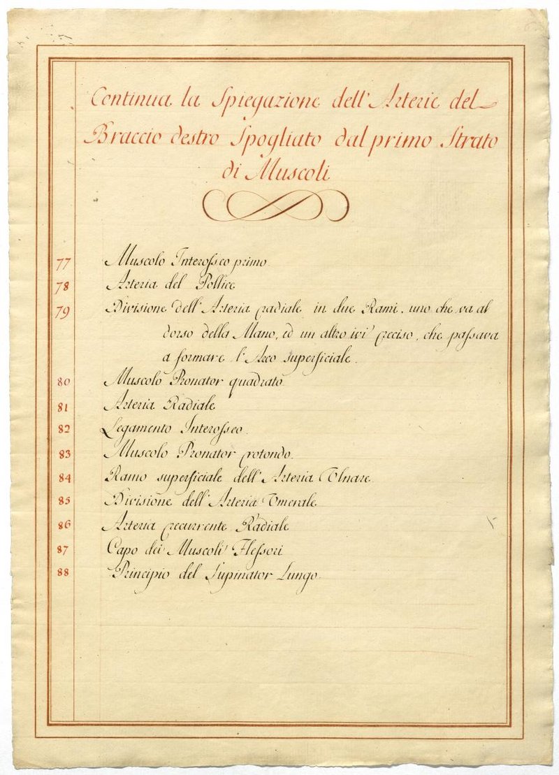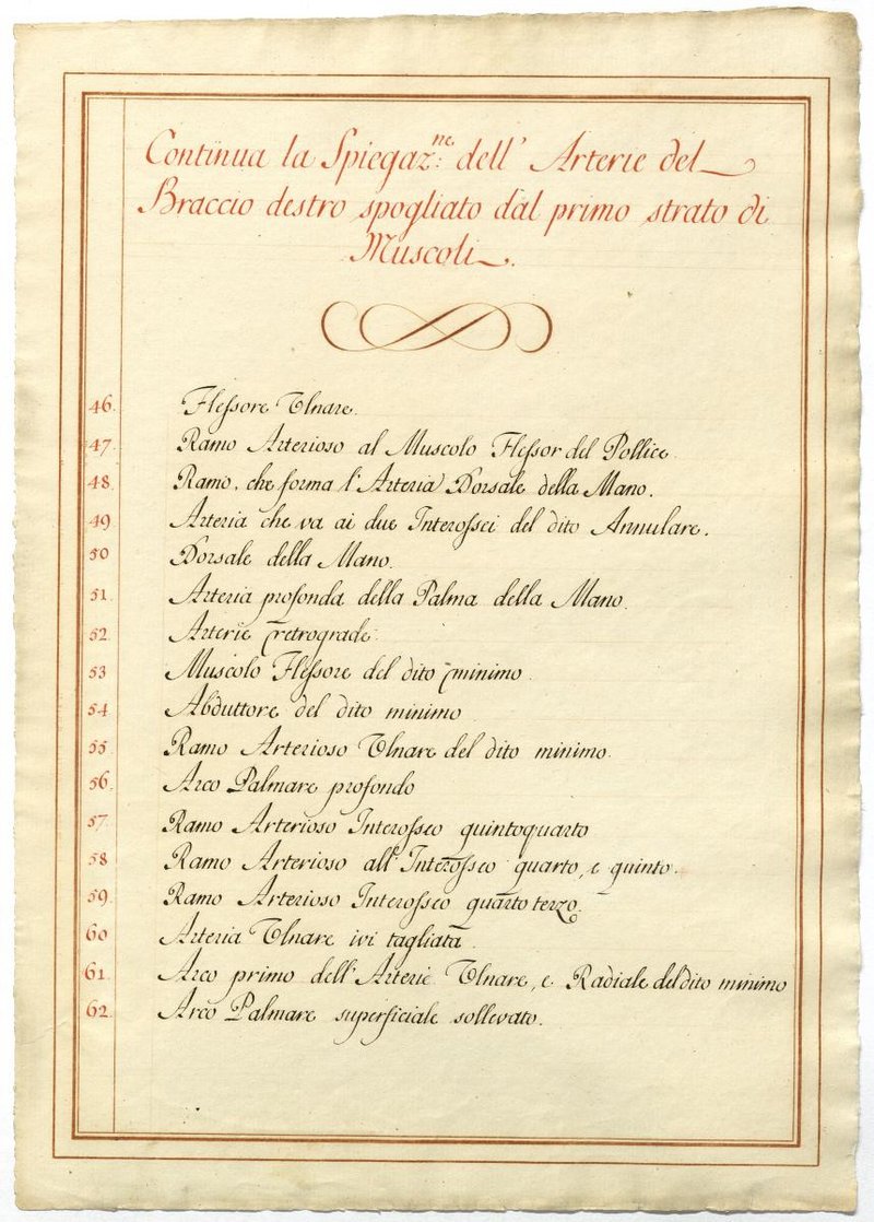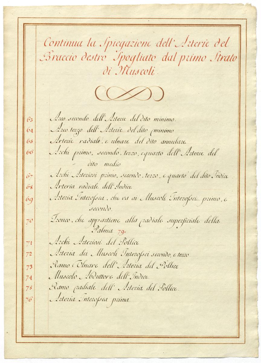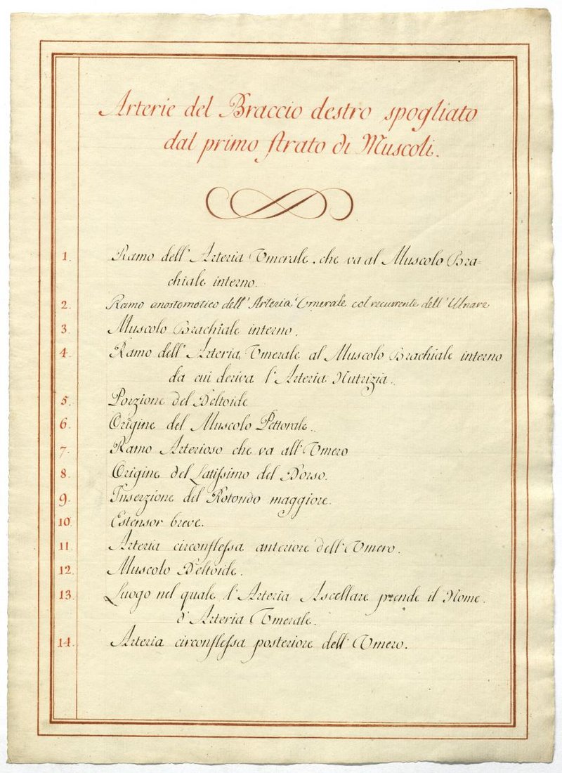 Der Text ist die ergänzende Beschreibung in italienischer Sprache zum anatomischen Wachsmodell der Fußsohlenarterie.