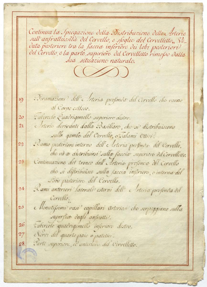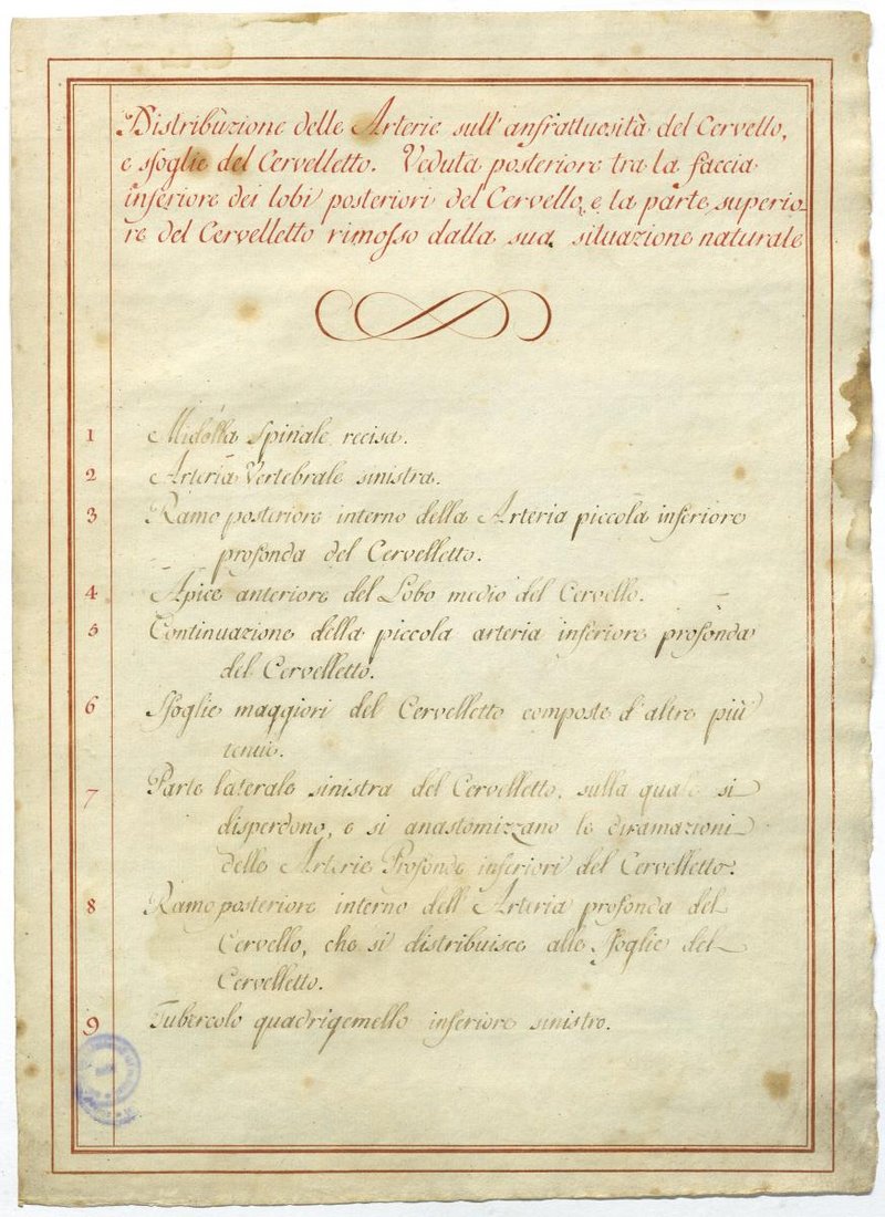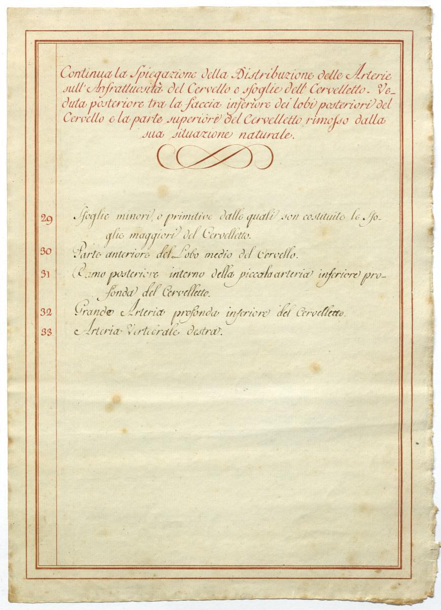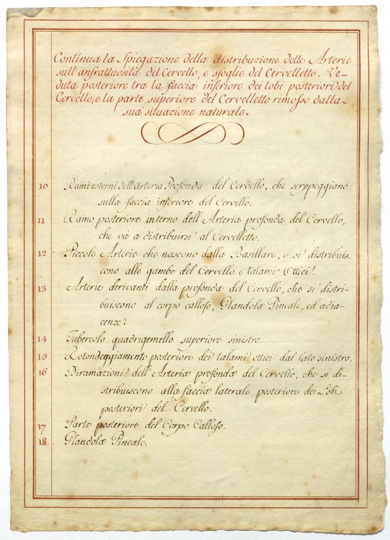Der Text ist die ergänzende Beschreibung in italienischer Sprache zum anatomischen Wachsmodell der Hirnbasis.