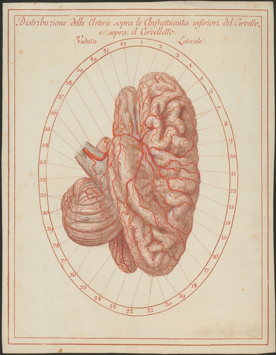 Schlagadern des Großhirns, des Kleinhirns und des Hirnstammes, von hinten unten. Das Kleinhirn wurde aus seiner natürlichen Lage gebracht und die Großhirnhemisphären wurden auseinandergezogen.
