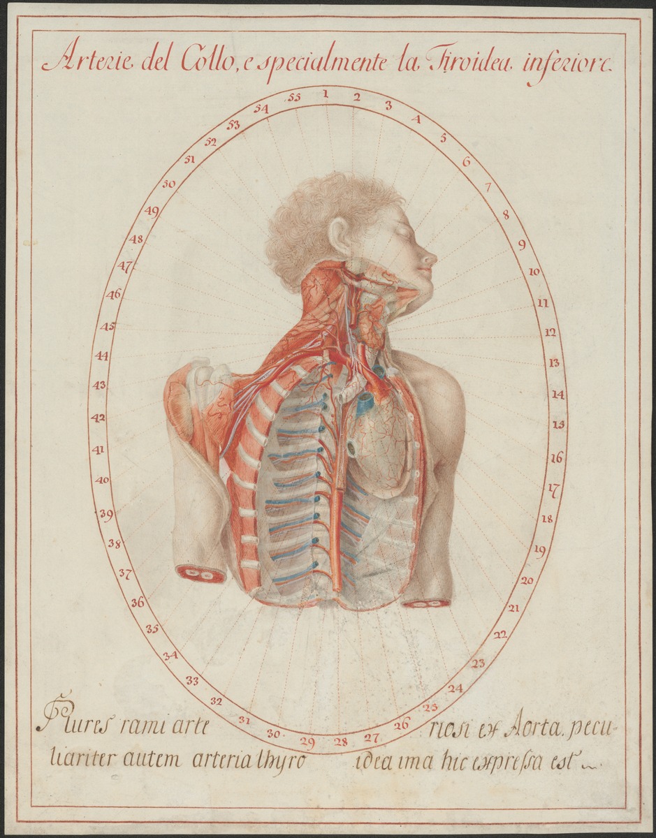 Parallel zur im mittleren Abschnitt entfernten Halsschlagader (Arteria carotis communis) verläuft der Nervus vagus in Richtung Brustkorb, wo er bis in sein Geflecht, den Plexus oesophageus, um die Speiseröhre ansichtig ist. Darstellung der Nervenschlaufe des Nervus laryngeus recurrens, einem Ast des Nervus vagus, der sich rechts um die Unterschlüsselbeinarterie, Arteria subclavia, schlingt, um zurück zum Kehlkopf zu ziehen. Auf der rechten Seite sieht man zudem den weiteren Verlauf von Arteria subclavia, ihren Übergang in die Achselarteria, Arteria axillaris, und dem parallel dazu verlaufenden Armgeflecht, dem Plexus brachialis. Hier muss auf eine nicht regelhafte Darstellung von Nervus ulnaris und Nervus medianus hingewiesen werden. Der Nervus medianus ist klassischerweise durch die Medianusgabel (gebildet aus zwei Faszikeln des Plexus, die die Arteria subclavia einschließen) gekennzeichet und verläuft in diesem Modell am weitesten medial. Lateral davon sieht man in diesem Modell den Nervus ulnaris. Im Regelfall befindet sich der Nervus ulnaris jedoch medial und der Nervus medianus lateral daneben.