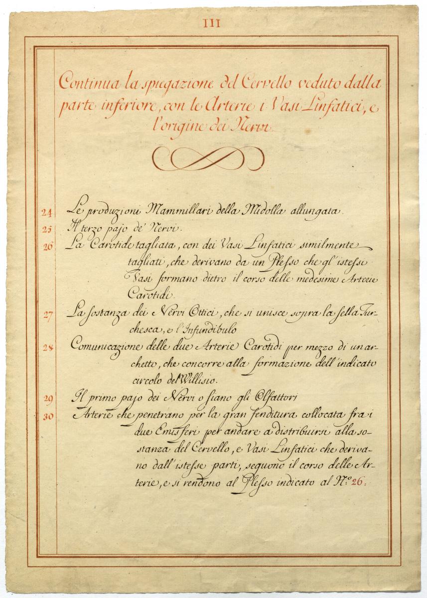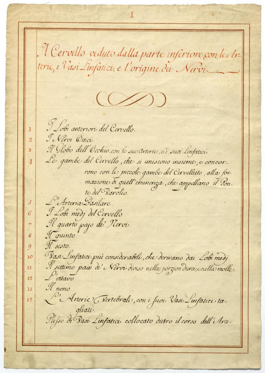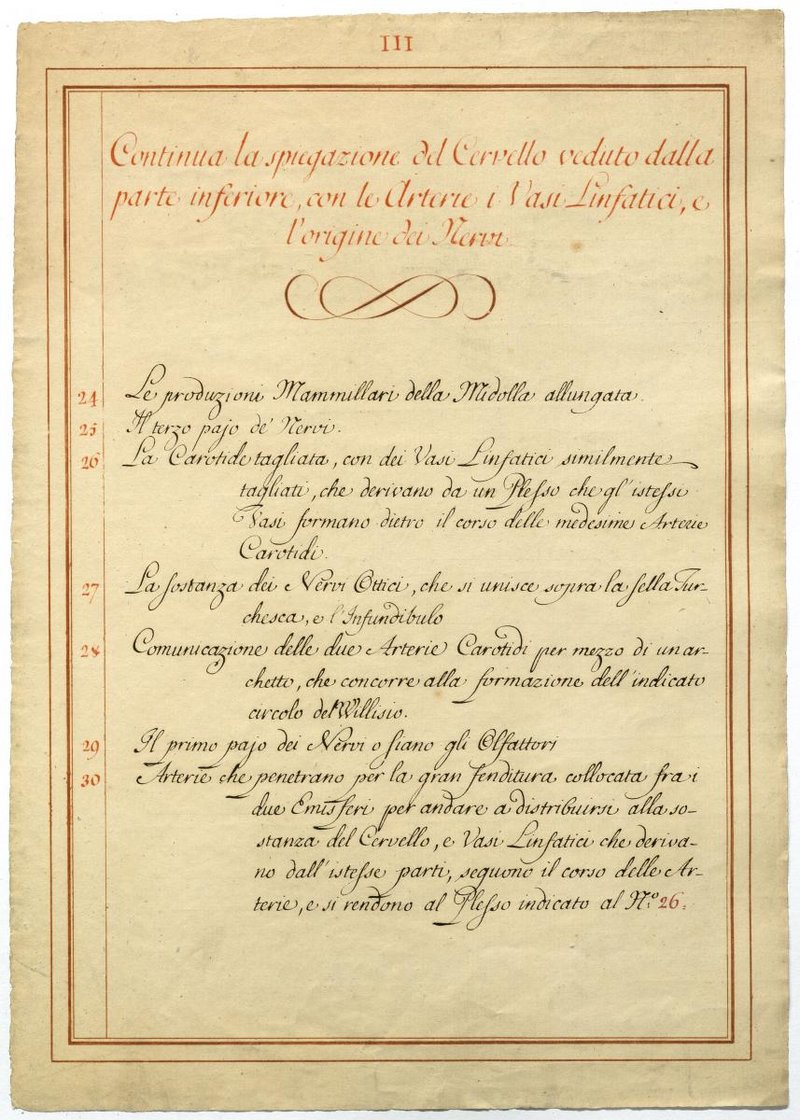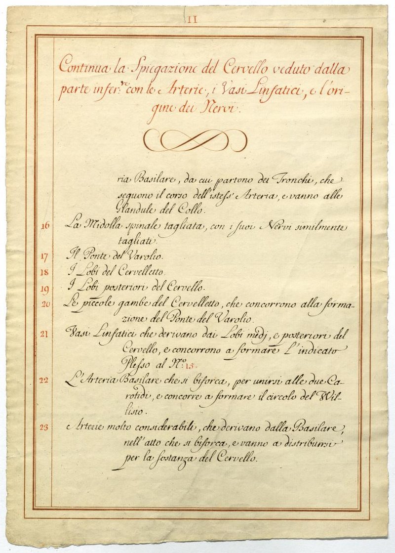 Der Text ist die ergänzende Beschreibung in italienischer Sprache zum anatomischen Wachsmodell der Hirnbasis.