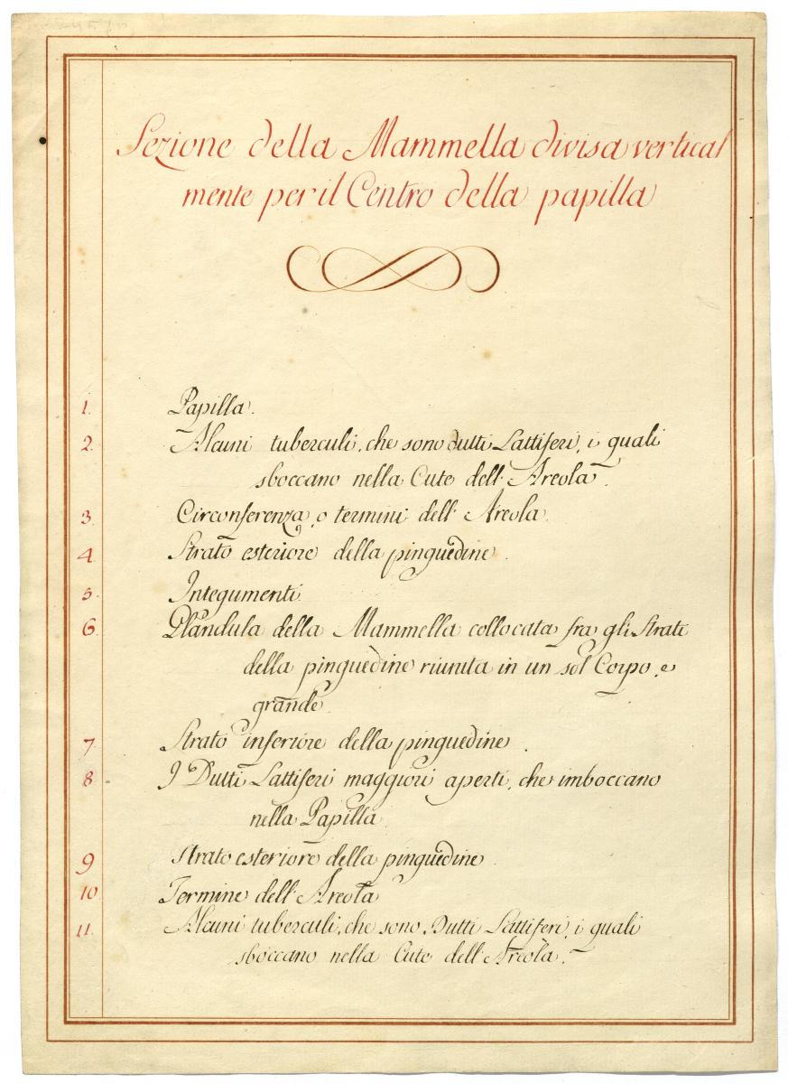 Der Text ist die ergänzende Beschreibung in italienischer Sprache zum anatomischen Wachsmodell der Brustdrüse.