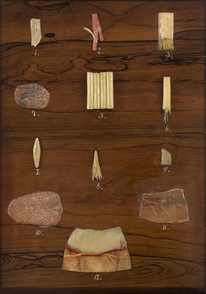 1. Sehnenfaserbündel. 2. und 3. Teil einer Sehne, vergrößert dargestellt. 4. Ein Stück Bindegewebe, vergrößert dargestellt. 5. bis 7. Quergestreifte Muskelfasern. 8. Muskelfaserbündel ohne bindegewebige Hülle. 9. Ein Stück vom sehnigen Teil des Zwerchfells eines Kaninchens, vergrößert dargestellt. 10. Ein Stück Bindegewebe, vergrößert dargestellt. 11. Ein Stück vom Zwerchfell eines menschlichen Fötus mit injizierten Arterien. 12. Ein Stück vom sehnigen Teil des Zwerchfells eines Kaninchens mit Darstellung von Nerven und Arterien.