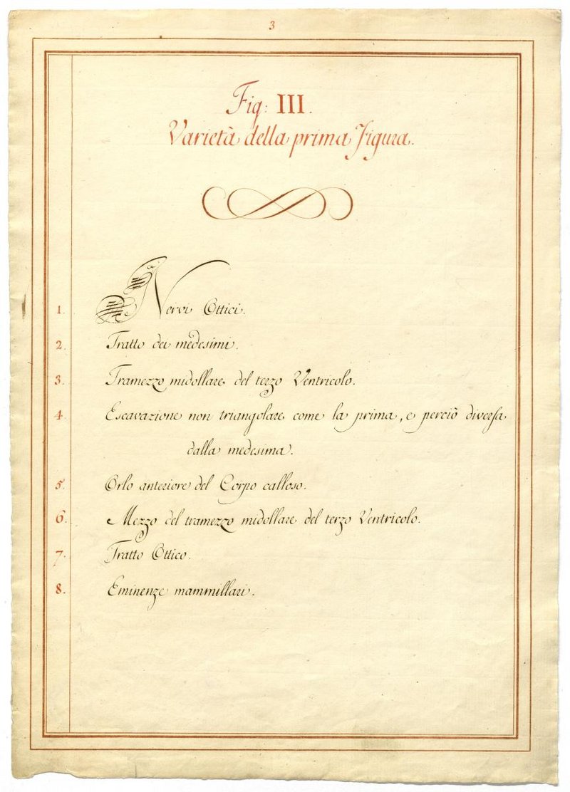 Der Text ist die ergänzende Beschreibung in italienischer Sprache zum anatomischen Wachsmodell der Sehbahn.