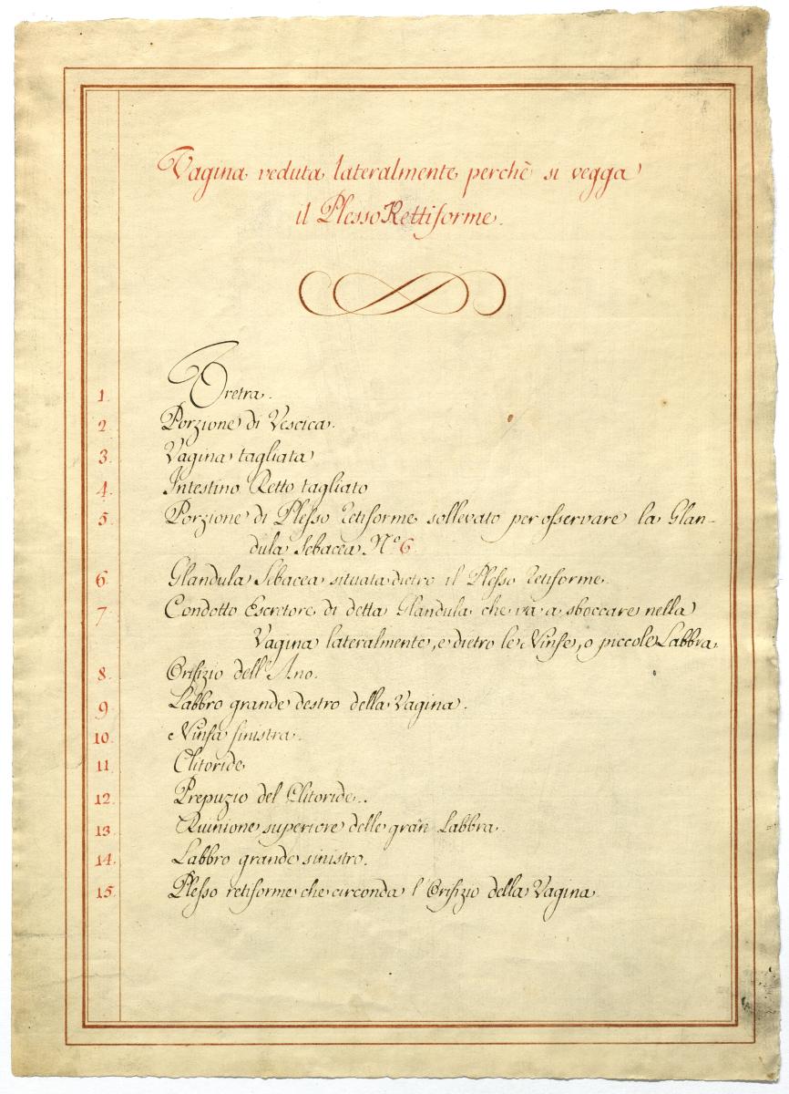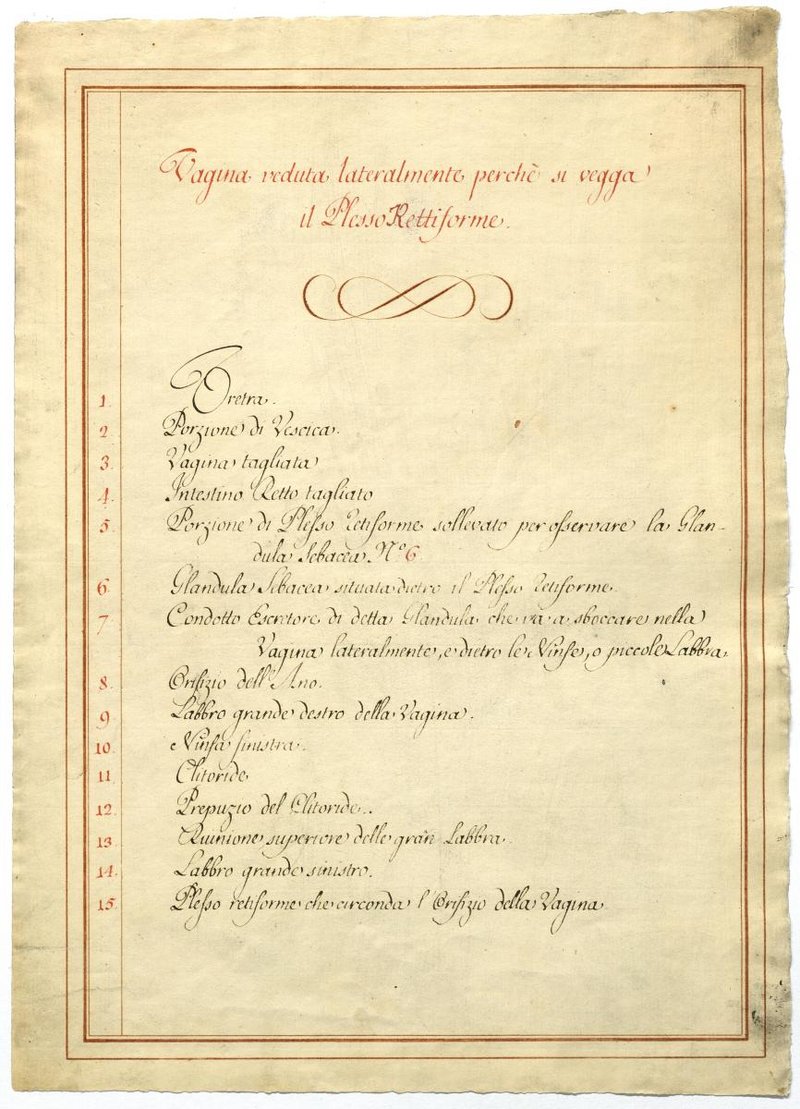 Der Text ist die ergänzende Beschreibung in italienischer Sprache zum anatomischen Wachsmodell des weiblichen Genitale.