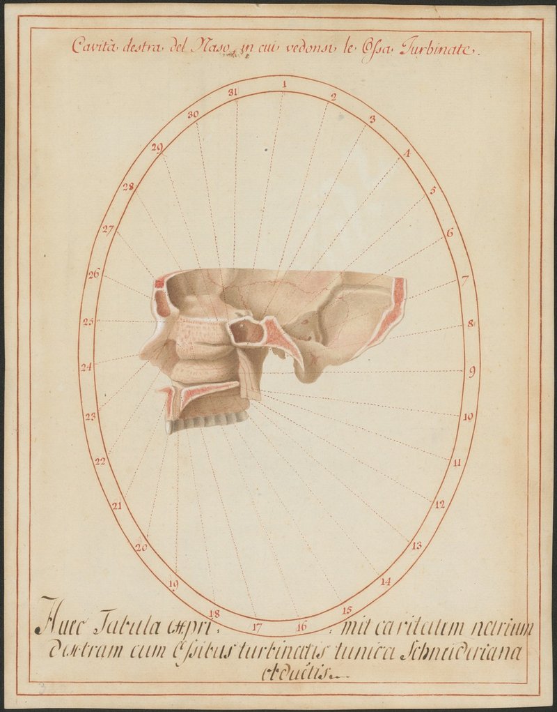 Seitliche Wand der Nasenhöhle mit den Nasenmuscheln (Conchae nasales), an einer median durchsägten Schädelbasis dargestellt.