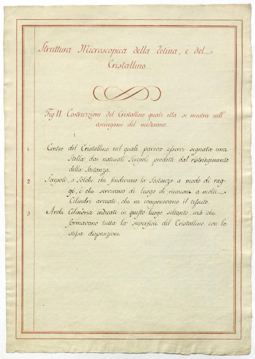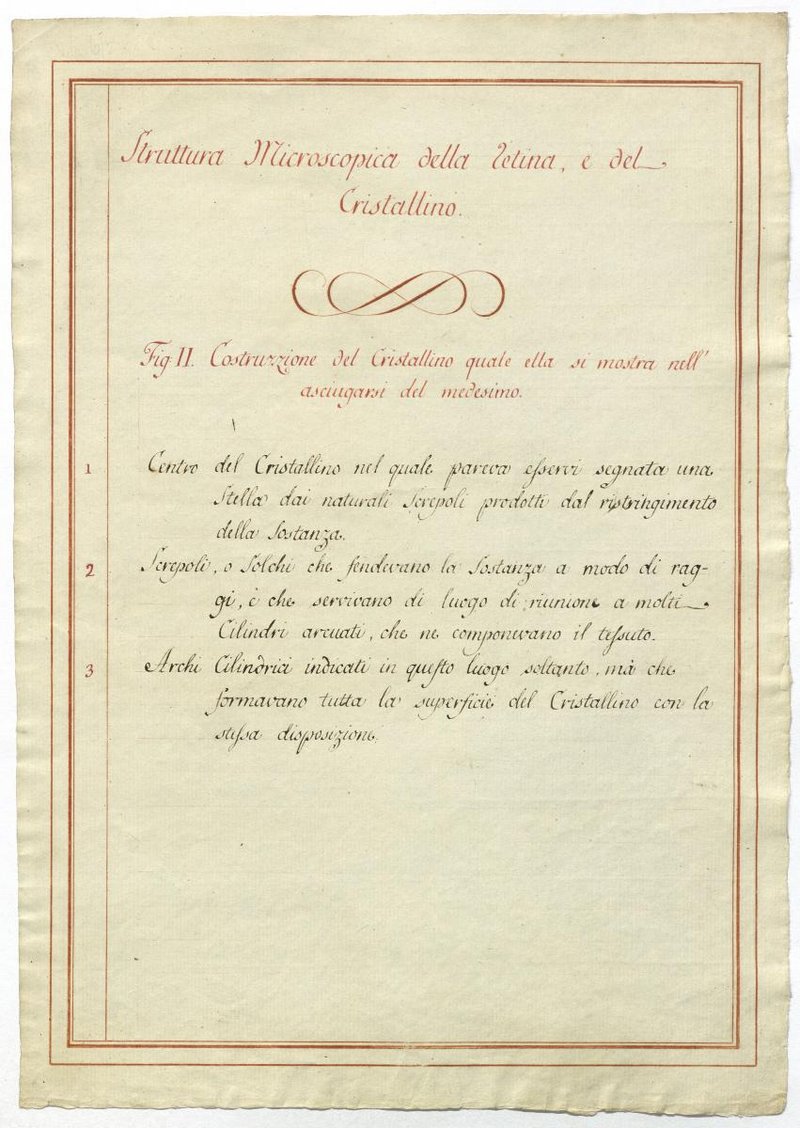 Der Text ist die ergänzende Beschreibung in italienischer Sprache zum anatomischen Wachsmodell unterschiedlicher Gewebe.