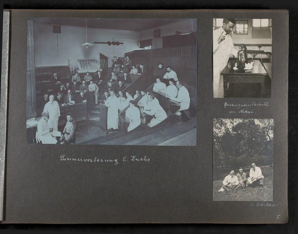 Links: Studierende bei der Sommervorlesung von Ernst Fuchs; rechts oben: Karl David Lindner beim Gesangunterricht mit dem Affen Maxi; rechts unten: Karl David Lindner mit Hans Barkan und einer weiteren Person.