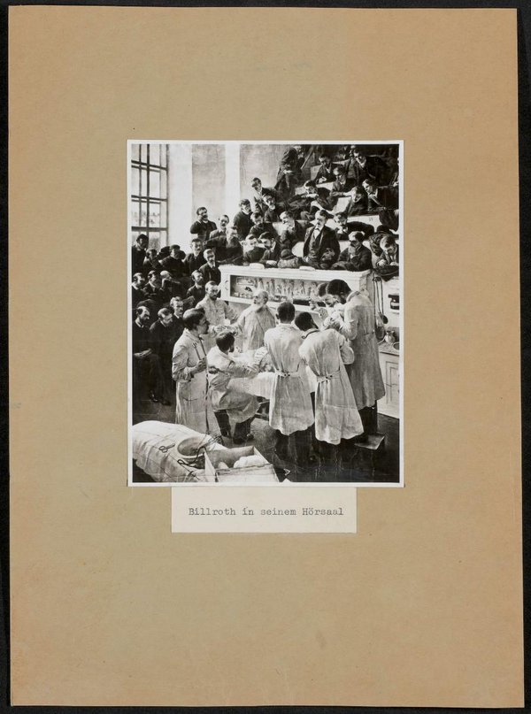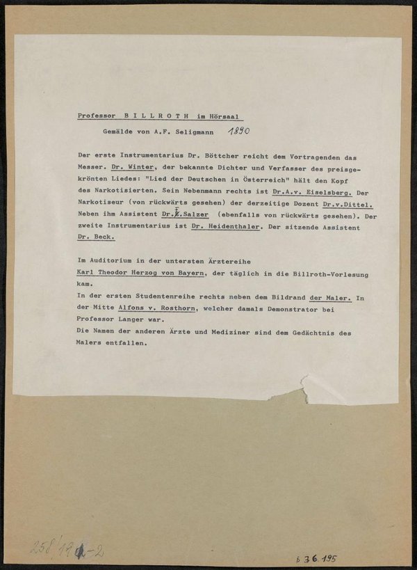 Auf dem Bild sind u.a. zu sehen: Arthur Boettcher, Josef Winter Edler von Wignar, Anton von Eiselsberg, Friedrich Franz Salzer, Alexander Haidenthaler und Herr Beck sowie im Auditorium Karl Theodor Herzog von Bayern, Alfons von Rosthorn und Adalbert Franz Seligmann. Vorlage war das Gemälde von Adalbert Franz Seligmann. Rückseitig mit Erläuterungen zum Motiv und zu den abgebildeten Personen.