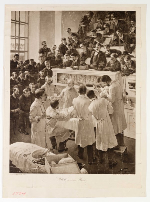 Auf dem Bild sind u.a. zu sehen: Arthur Boettcher, Josef Winter Edler von Wignar, Anton von Eiselsberg, Friedrich Franz Salzer, Alexander Haidenthaler und Herr Beck sowie im Auditorium Karl Theodor Herzog von Bayern, Alfons von Rosthorn und Adalbert Franz Seligmann. Grundlage war das Gemälde von Adalbert Franz Seligmann. Der Druck wurde von der Wiener Kunstdruck AG, Wien, angefertigt und von der Oesterreichischen Verlagsgesellschaft, Wien, vertrieben. Digitalisat von Reiner Riedler.