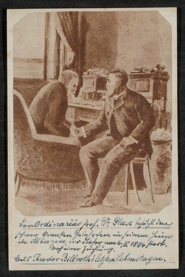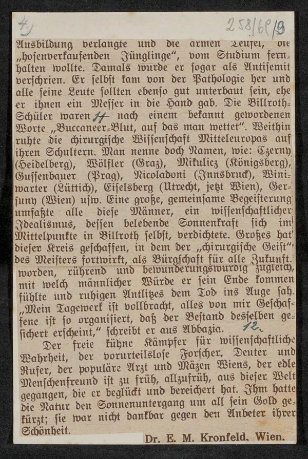Der Ausschnitt ist vermutlich einem Artikel von Ernst Moritz Kronfeld entnommen worden, der anlässlich von Billroths 100. Geburtstag in der Wiener Zeitung erschienen ist.