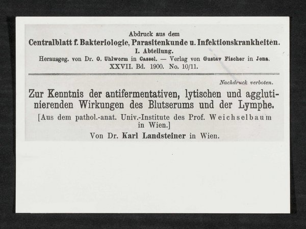 Erschienen ist der Beitrag in: Centralblatt für Bakteriologie, Parasitenkunde und Infektionskrankheiten, I. Abteilung, Bd. 27, Nr. 10/11, 1900, im Verlag von Gustav Fischer. Mit Angaben auf der Rückseite, die auf die Nutzung für eine Drucklegung hindeuten. Neg (9x12) 573, 574