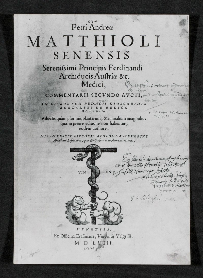 Auszug aus: Pietro Andrea Mattioli, Comentarii secundo aucti, in libros sex Pedarii Dioscordis Anazarbei de Medica Materia, Venedig 1558. Als Verleger war Vincenzo Valgrisi beteiligt.