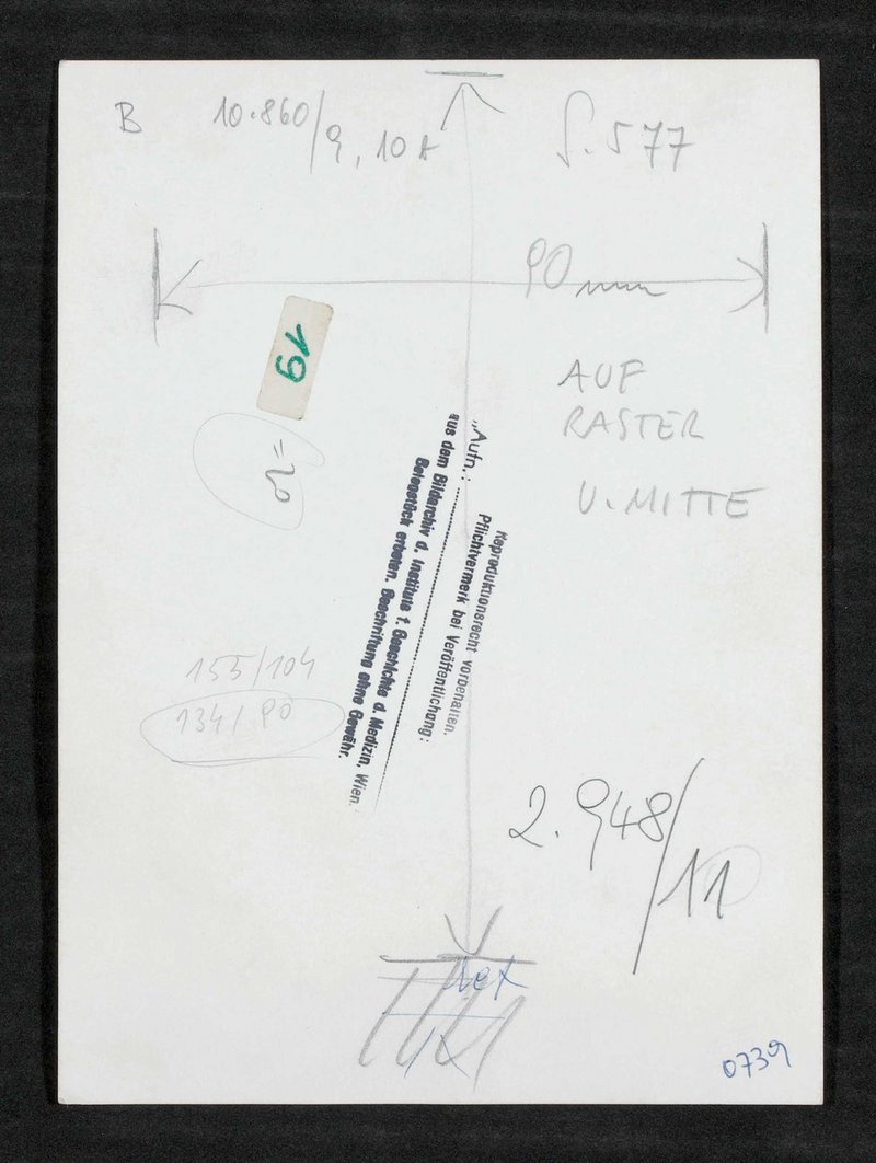 Vorder- und rückseitig mit jeweils einem Stempel des Instituts für Geschichte der Medizin, Wien, versehen. Mit Maßangaben auf der Vorder- und der Rückseite, die auf die Nutzung für eine Publikation hindeuten.
