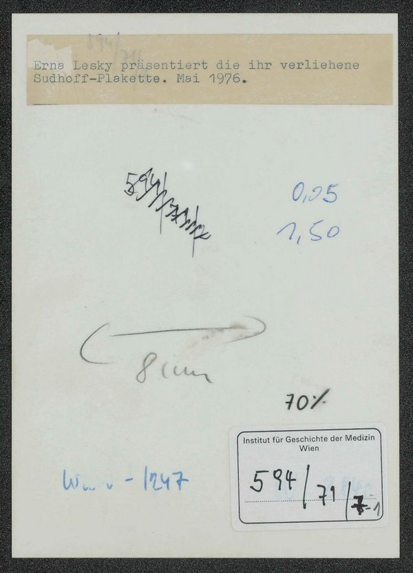 Aus einer Serie von 15 Fotografien, die die Überreichung der Sudhoff-Plakette und die anschließenden Feierlichkeiten am 24. Mai 1976 dokumentieren. Fotografie: Robert Nedorost. Neg. I 322/1-23