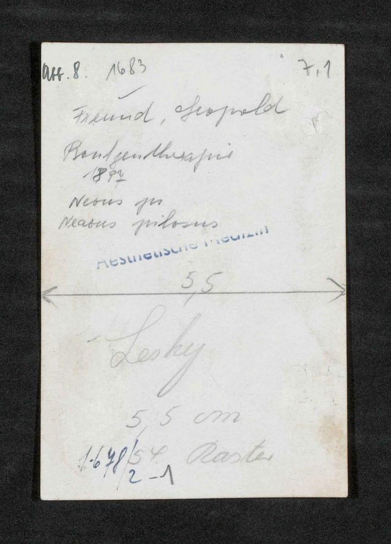 Die Vorlage stammt aus: Ein mit Röntgenstrahlen behandelter Fall von Naevus pigmentosus piliferus, in: Wiener Medizinische Wochenschrift, Nr. 47, 1897. Neg. (9x12) 436