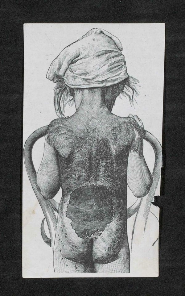 Die Vorlage stammt aus: Ein mit Röntgenstrahlen behandelter Fall von Naevus pigmentosus piliferus, in: Wiener Medizinische Wochenschrift, Nr. 47, 1897. Neg. (9x12) 436
