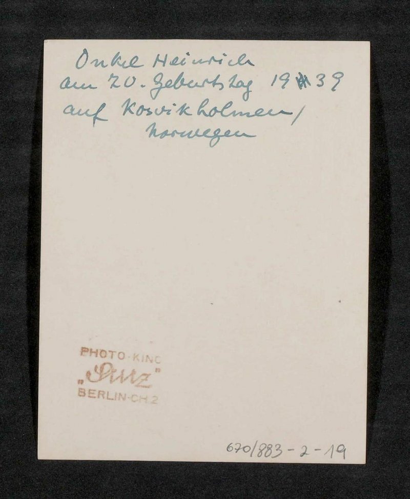 Auf der Rückseite des Bildes ist notiert: Onkel Heinrich am 20. Geburtstag 1939 auf Kosvikhomnen, Norwegen.