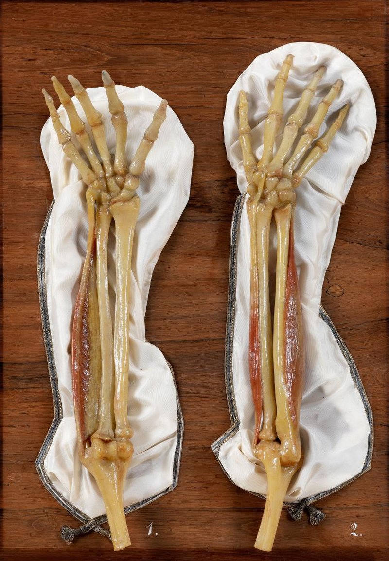 1. Distaler Oberarmknochen (Humerus), Unterarmknochen – Elle (Ulna) und Speiche (Radius) und Knochen der Hand der rechten Seite von vorne. Musculus flexor carpi ulnaris. 2. Distaler Oberarmknochen (Humerus), Unterarmknochen – Elle (Ulna) und Speiche (Radius) und Knochen der Hand der rechten Seite von hinten. Musculus extensor carpi radialis brevis und Musculus extensor carpi ulnaris.