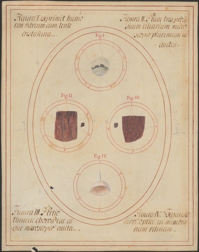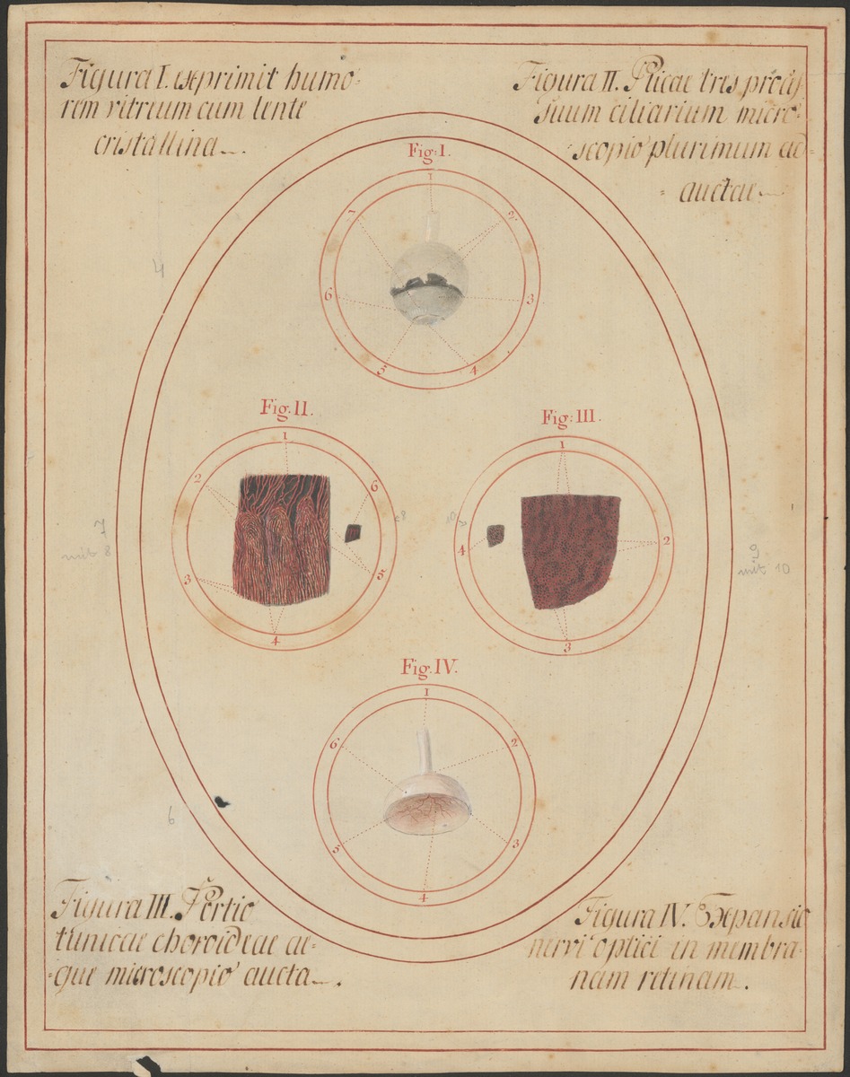 Fig. 1: 322/4: Der Glaskörper (Corpus vitreum), durch teilweises Entfernen der Schichten des Augapfels freigelegt. Fig. 4: 322/6: Die hintere Hälfte des Augapfels: der Glaskörper (Corpus vitreum) wurde zur Darstellung der Netzhautarterie (Arteria centralis retinae) entfernt. Fig. 2: 322/7: Drei Processus ciliares des Corpus ciliare, vergrößert dargestellt. Fig. 2: 322/8: Die Processus ciliares des Corpus ciliare, in natürlicher Größe. Fig. 3: 322/9: Die Gefäße der Aderhaut (Vasa chorioidea) an einem Flächenpräparat, vergrößert dargestellt. Fig. 3: 322/10: Die Gefäße der Aderhaut (Vasa chorioidea), in natürlicher Größe.