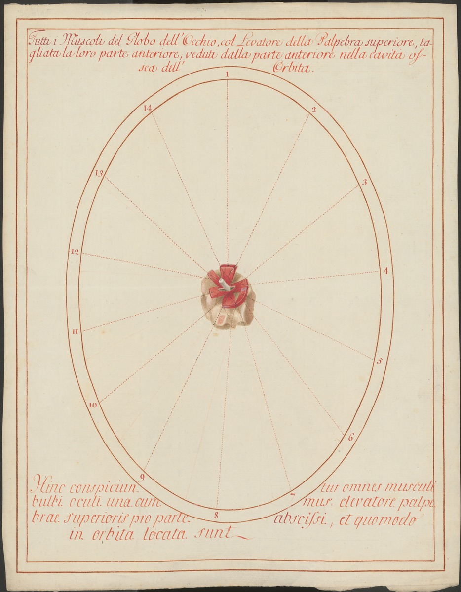 Ursprünge der Augenmuskeln (Musculi bulbi) an der Rückseite der Augenhöhle (Orbita) und der Heber des oberen Augenlides (Musculus levator palpebrae superioris).