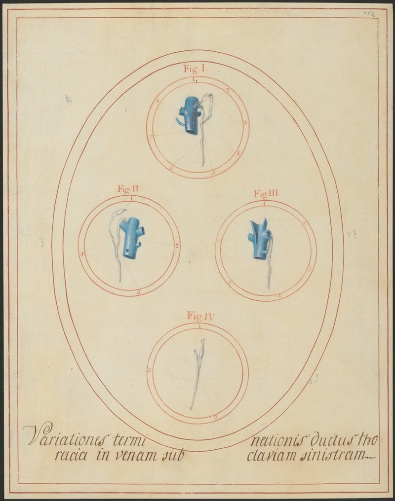 Fig. 1: 182/2 Fig. 2: 182/3 Fig. 3: 182/4 (Präparat fehlt) Fig. 4: 182/5 (Präparat fehlt) Varietäten der Einmündung des Milchbrustganges (Ductus thoracicus).