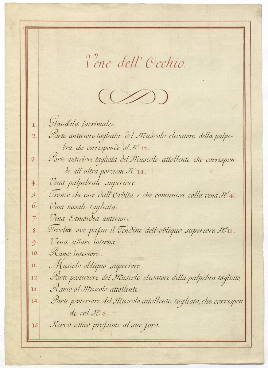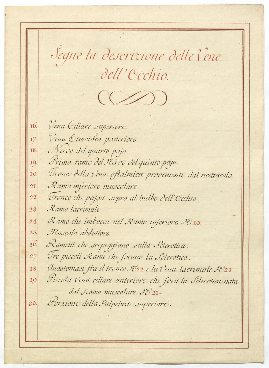 Der Text ist die ergänzende Beschreibung in italienischer Sprache zum anatomischen Wachsmodell der Hilfsmittel des Auges.