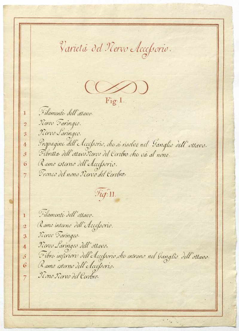 Der Text ist die ergänzende Beschreibung in italienischer Sprache zum anatomischen Wachsmodell des Nervus accessorius.