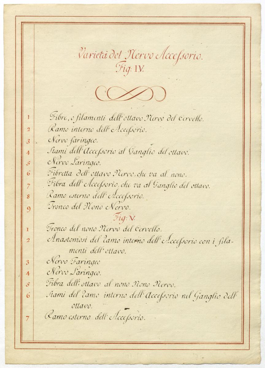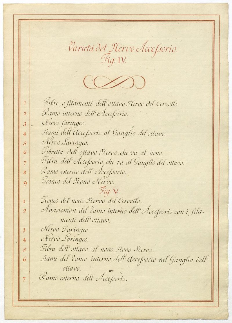 Der Text ist die ergänzende Beschreibung in italienischer Sprache zum anatomischen Wachsmodell des Nervus accessorius.