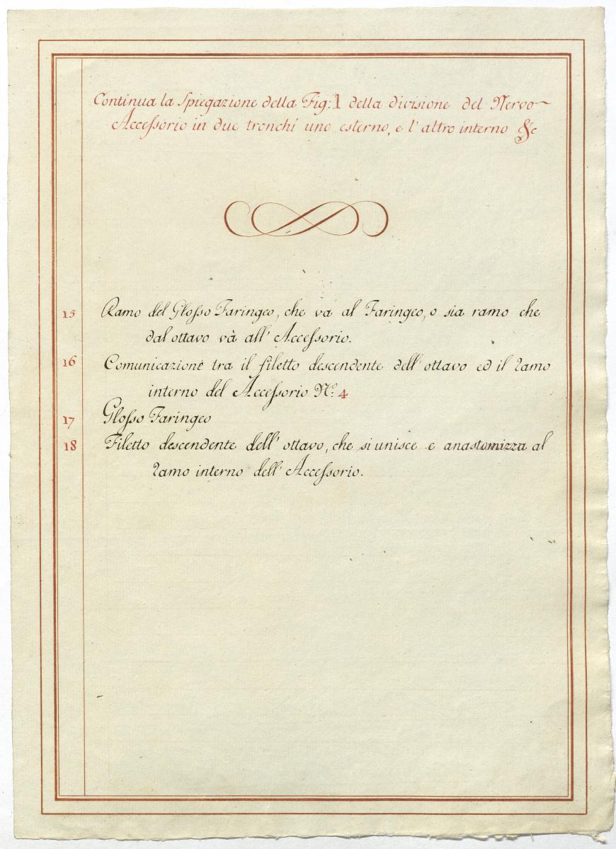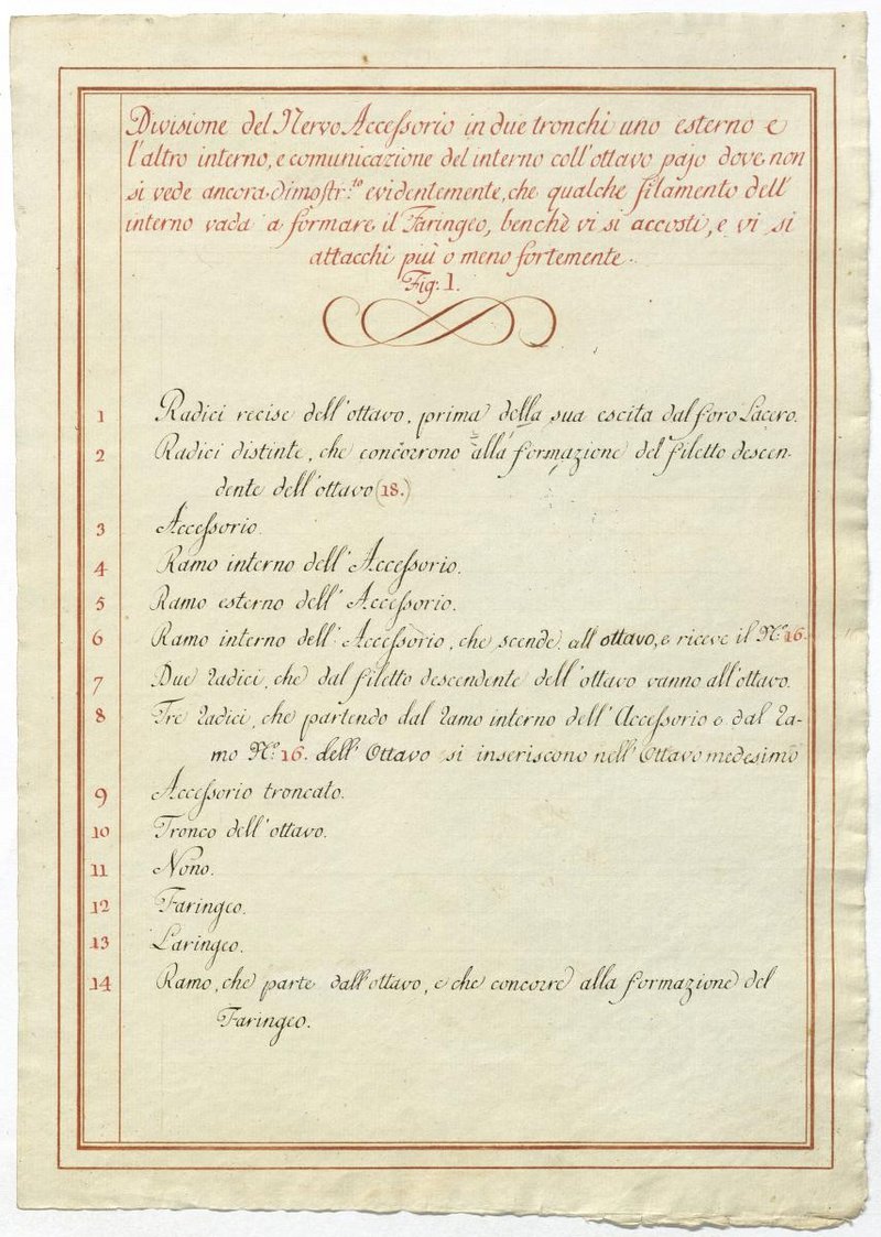 Der Text ist die ergänzende Beschreibung in italienischer Sprache zum anatomischen Wachsmodell des Nervus accessorius.