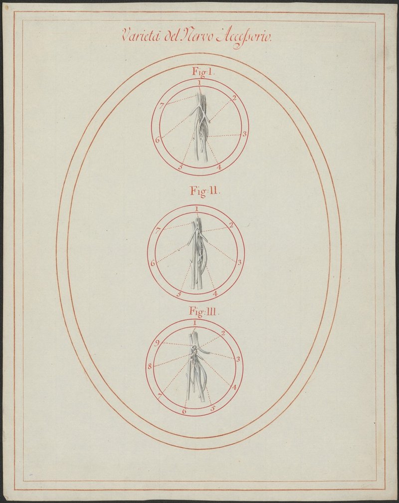 Verschiedene Verzweigungsarten des 11. Hirnnerven (Nervus accessorius) und dessen Verhalten zum 10. Hirnnerven (Nervus vagus) und dem Schlundnervengeflecht (Plexus pharyngeus).