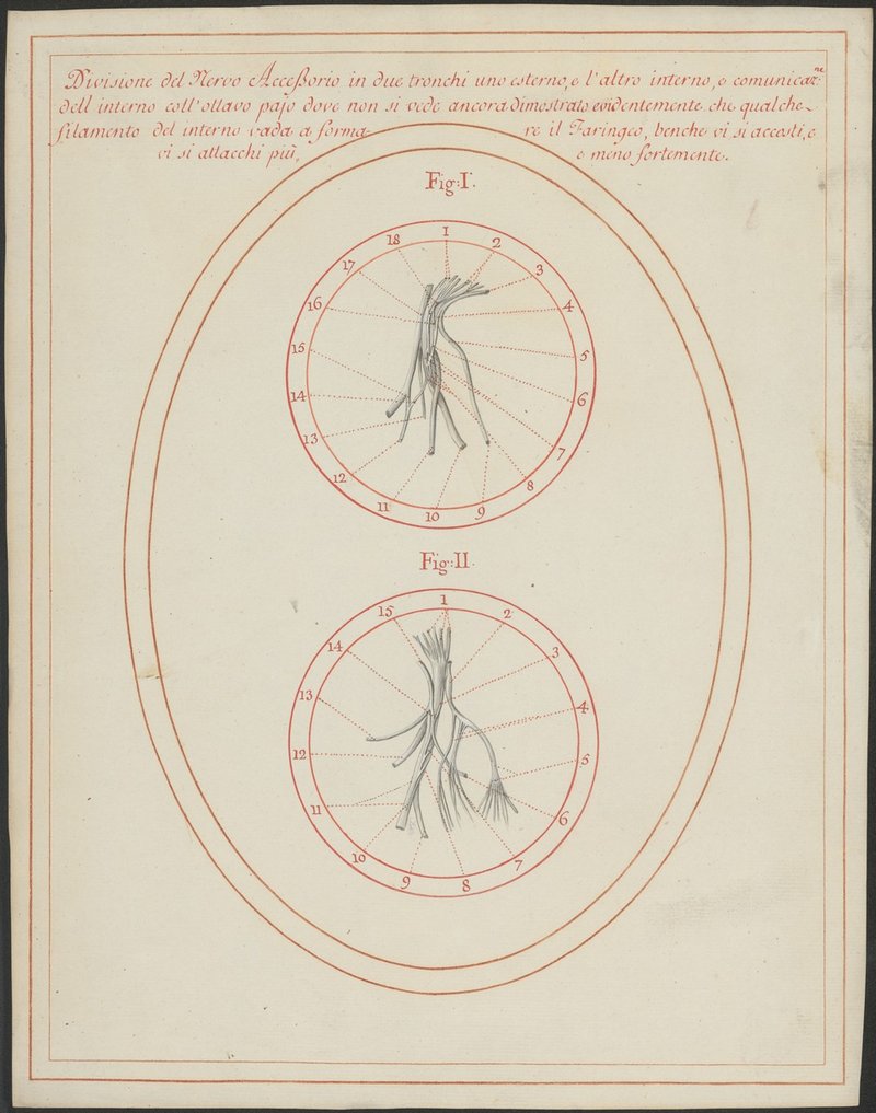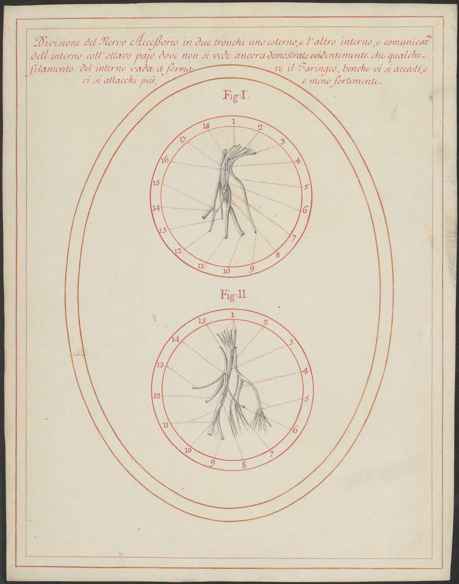 Fig. 1: 310/7 Fig. 2: 310/10 Verschiedene Verzweigungsarten des 11. Hirnnerven (Nervus accessorius) und dessen Verhalten zum 10. Hirnnerven (Nervus vagus) und dem Schlundnervengeflecht (Plexus pharyngeus).