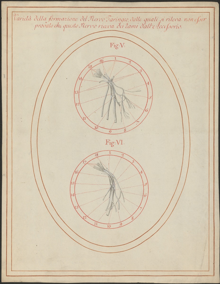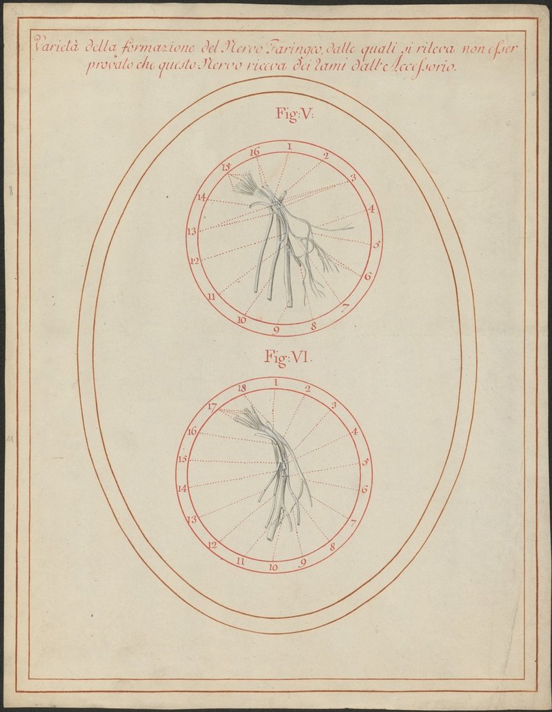 Fig. 5: 310/8 Fig. 6: 310/11 Verschiedene Verzweigungsarten des 11. Hirnnerven (Nervus accessorius) und dessen Verhalten zum 10. Hirnnerven (Nervus vagus) und dem Schlundnervengeflecht (Plexus pharyngeus).