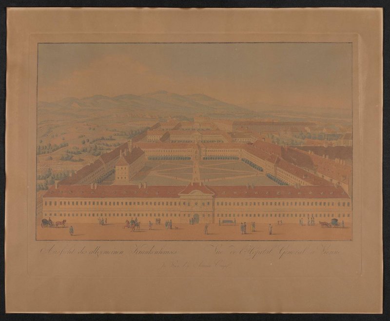 Bildunterschrift: Gezeichnet und gestochen von Joseph u. Peter Schaffer, Ansicht des allgemeinen Krankenhauses, vue de l'Hospital General a Vienne, in Wien bey Artaria Compl. Erschienen in: Sammlung von Aussichten der Residenzstadt Wien von ihren Vorstädten und einigen umliegenden Oertern. Gezeichnet und gestochen von Karl Schütz, Mitglied der k.k. Akademie der bildenden Künsten, und von Johann Ziegler, Wien: Artaria [1779/1798], Tafel 16. Neg III 76/6 Ektachrom (9 x 12) 22 Farbnegativ (9 x 12) 652