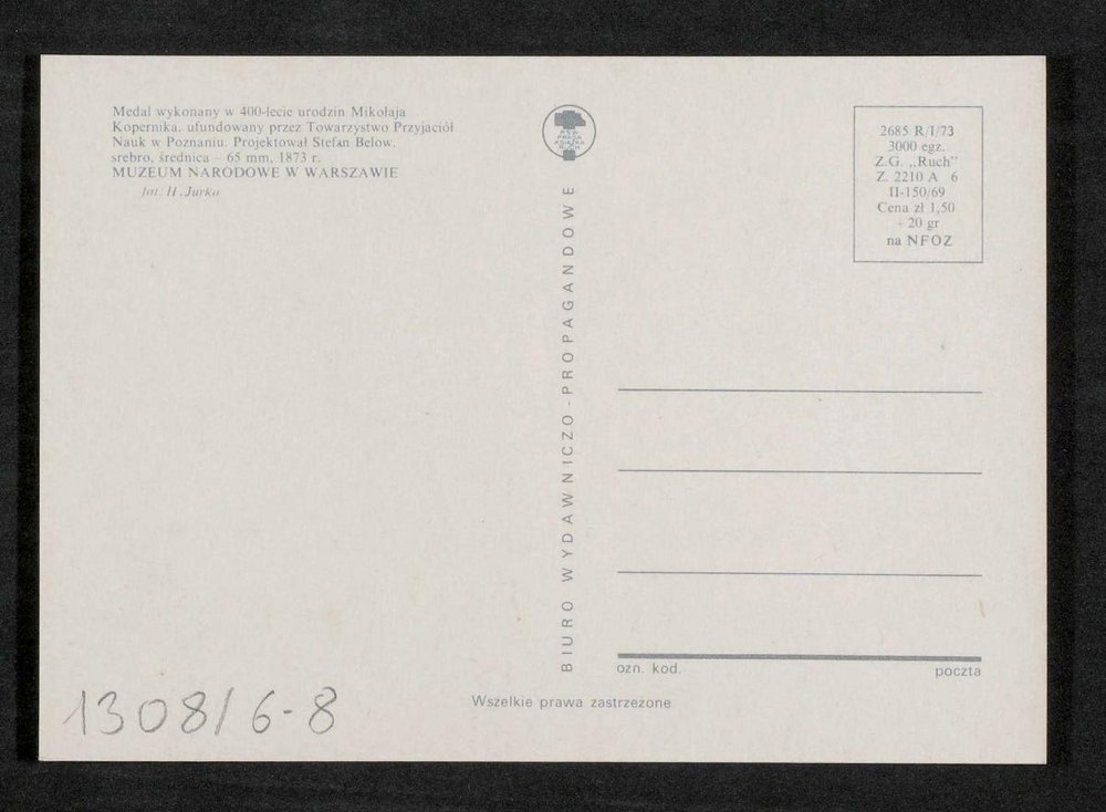 Die Medaille wurde von Stefan Below 1873 entworfen. Aufnahme von H. Jurko und die Postkarte wurde von Biuro Wydawniczo-Propagandowe vertrieben.