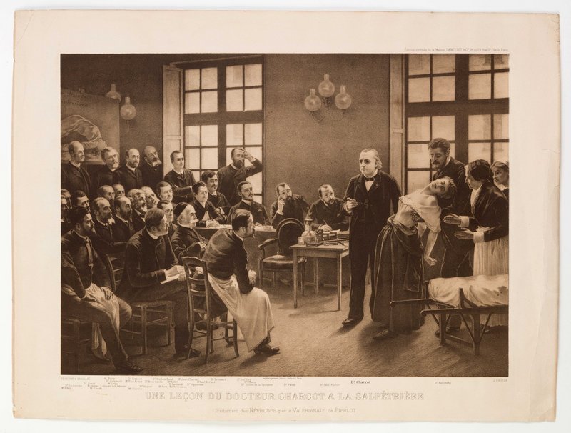 Die Druckvorlage stammt von Adolphe Braun und Co., Photographie, auf Grundlage des Gemäldes von André Brouillet, das sich heute in der Sammlung der Université Paris Cité, vormals Descartes Universität, Paris, befindet. Angefertigt wurde die Heliogravüre von Imp. R. Engelmann, Atelier Belford, Paris, 1887-1899. Die abgebildeten Personen sind: Jean-Martin Charcot, Joseph Babinski, Georges Gilles de la Tourette, Paul Richer, Charles Féré, Pierre Marie, Alix Joffroy, Édouard Brissaud, Paul Berbez, Jean-Baptiste Charcot, Mathias-Marie Duval, Georges Maurice Debove, Philippe Burty, Victor André Cornil, Édouard Lelorrain, Théodule-Armand Ribot, Georges Guinon, Léon Le Bas, Albert Gombault, Paul Arène, Arsène Arnaud Claretie, Alfred Joseph Naquet, Désiré-Magloire Bourneville, Gilbert Ballet, Romain Vigouroux, Henri Parinaud sowie Marie Wittman, die Patientin. Digitalisat von Reiner Riedler.