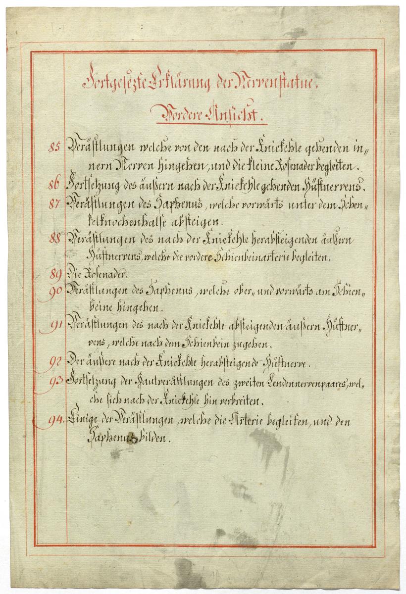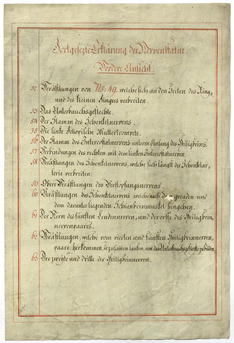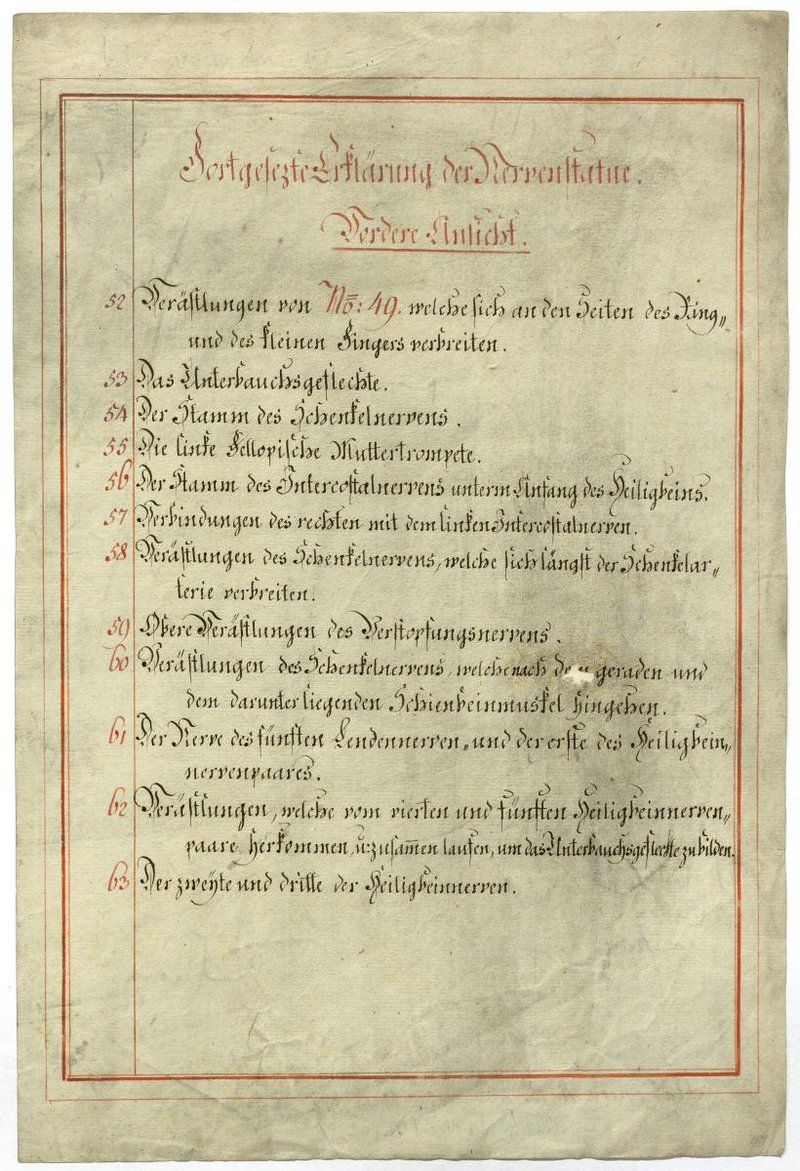 Der Text ist die ergänzende Beschreibung in deutscher Sprache zum anatomischen Wachsmodell der Leitungsbahnen und Eingeweide. Von ursprünglich wahrscheinlich 12 Blättern sind lediglich Blatt 5 und Blatt 8 erhalten.