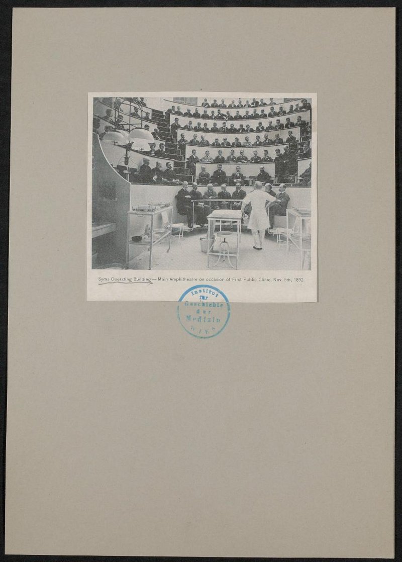 Auf der Rückseite des Ausschnittes befindet sich ein Grundrissplan vom Roosevelt Hospital, New York. Unter dem Bild befindet sich ein Stempel des Institutes für Geschichte der Medizin, Wien.
