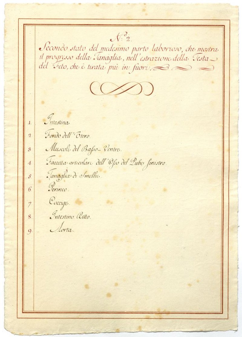 Der Text ist die ergänzende Beschreibung in italienischer Sprache zum anatomischen Wachsmodell einer Zangengeburt.