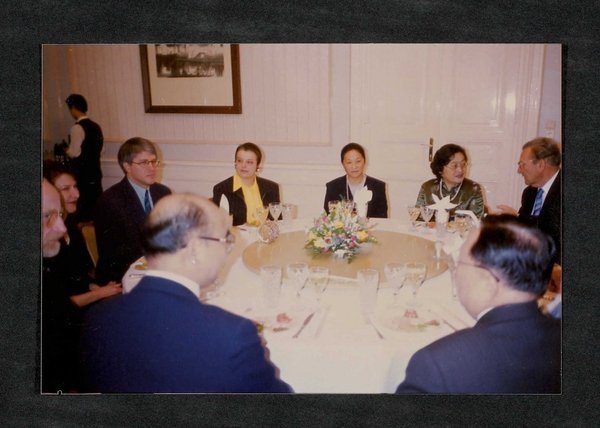 Abgebildet sind: Botschafter Wang Yanyi, Prof. Wu, Peking, Prof. Reuter, Deutschland, Karl Holubar, Wien, und teilweise die Ehefrauen der Abgebildeten.